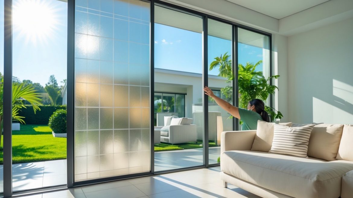 Sala de estar moderna con ventanas equipadas con láminas transparentes que reducen la temperatura interior sin aire acondicionado.